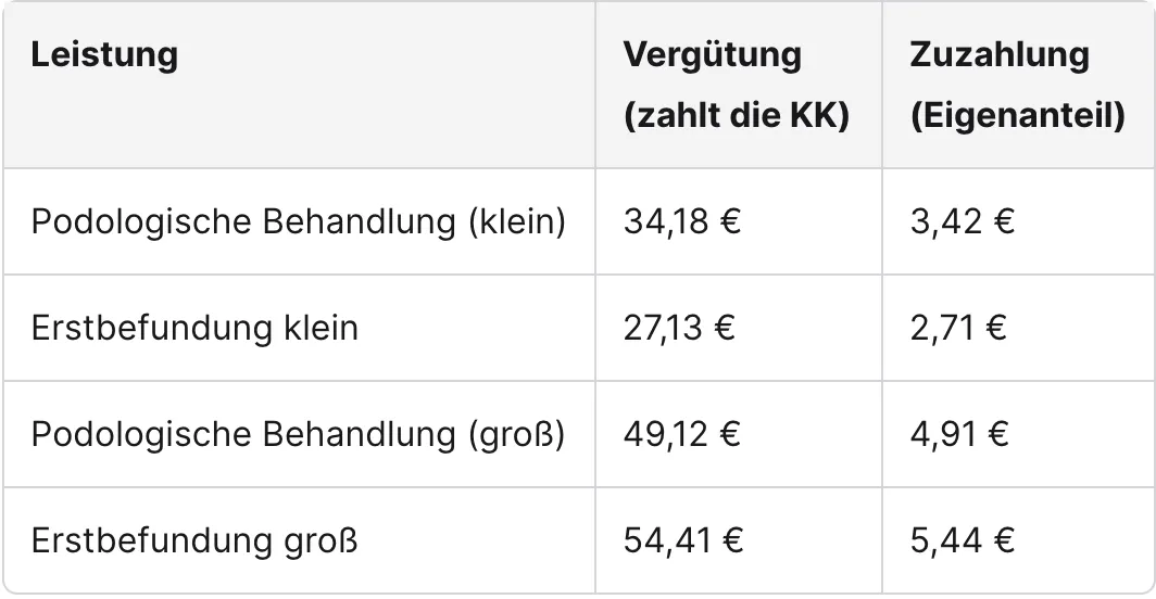 Liegt eine ärztliche Verordnung vor und fällt die Behandlung unter die podologische Behandlung, übernimmt die Krankenkasse in der Regel die Kosten. Für Patienten fällt eine Zuzahlung (Eigenanteil) in Höhe von ca. 10 Prozent der Behandlungskosten an sowie eine einmalige Zuzahlung in Höhe von 10 Euro pro Verordnung (Rezept).